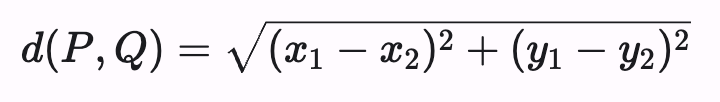 In het euclidisch vlak met X- en Y-as, bereken je als volgt de afstand d tussen twee punten P(x1, y1) en Q(x2, y2):