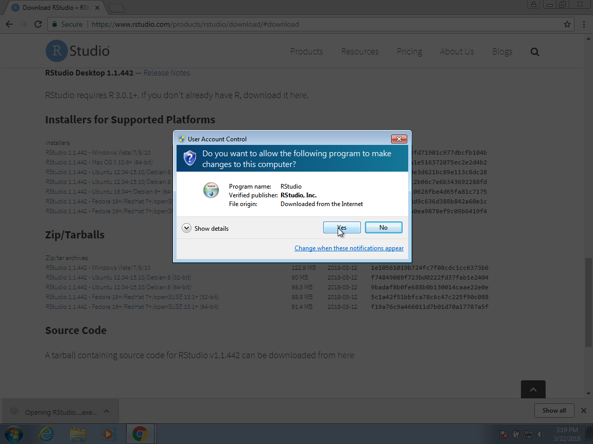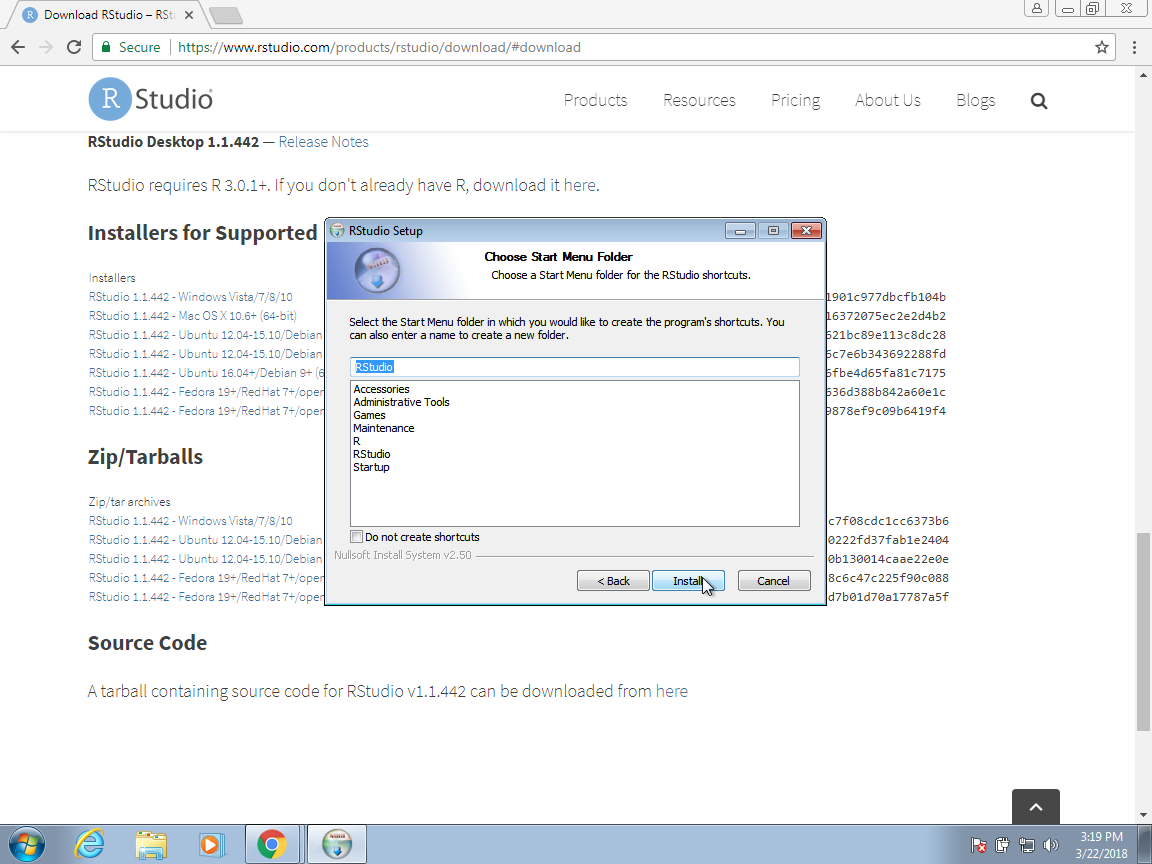 On the Mac, there are fewer clicks. You basically drag and drop the RStudio icon into the Applications folder icon here: