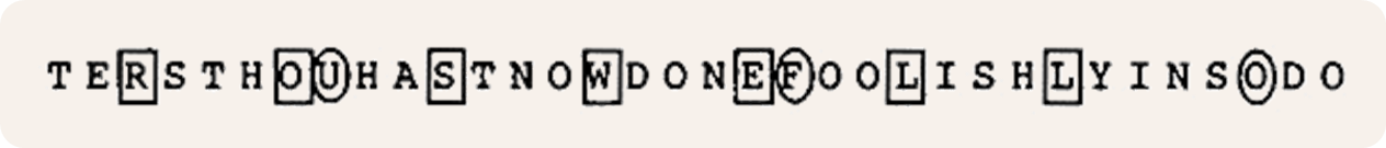 To find hidden messages, Drosnin makes use of a simple technique: start at a given letter in a text and repeatedly step a fixed number of letters forward of backward. Consider the verse in the Book of Genesis (King James Version): 31:28 And hast not suffered me to kiss my sons and my daughters? Thou hast now done foolishly in so doing. If you start at the R in daughters, and skip over three letters to the O in thou, and three more to the S in hast, and so on, the hidden message Roswell is revealed! A companion hidden message — UFO — is found by starting at the U in thou, and repeatedly stepping forward 12 letters. This can't be a coincidence, no?