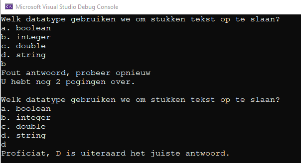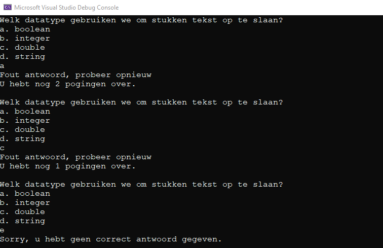Je maakt een console-applicatie waarbij de gebruiker een eenvoudige multiple-choice vraag moet beantwoorden. De gebruiker heeft 3 pogingen om de vraag juist te beantwoorden.