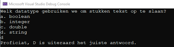 De vraag is: Welk datatype gebruiken we om stukken tekst op te slaan? a. boolean b. integer c. double d. string