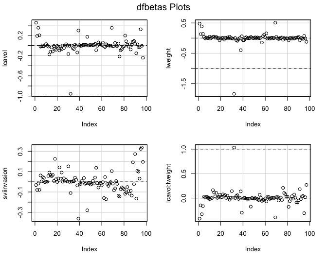 Figuur 69: DFBETAS voor model met lcavol:lweight interactie.