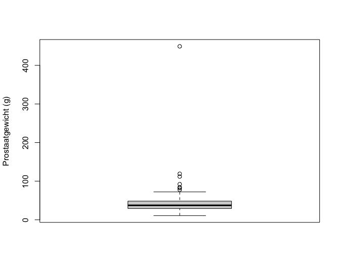 boxplot(exp(prostate$lweight),ylab="Prostaatgewicht (g)")