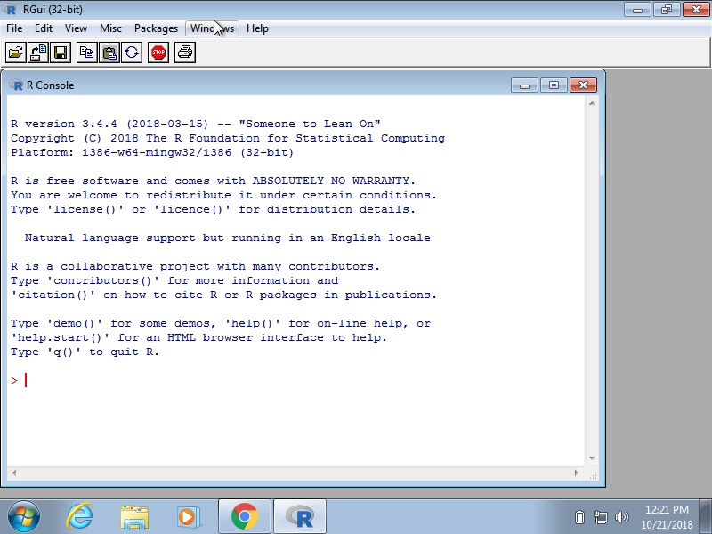 Interactive data analysis usually occurs on the R console that executes commands as you type them. There are several ways to gain access to an R console. One way is to simply start R on your computer. The console looks something like this:
