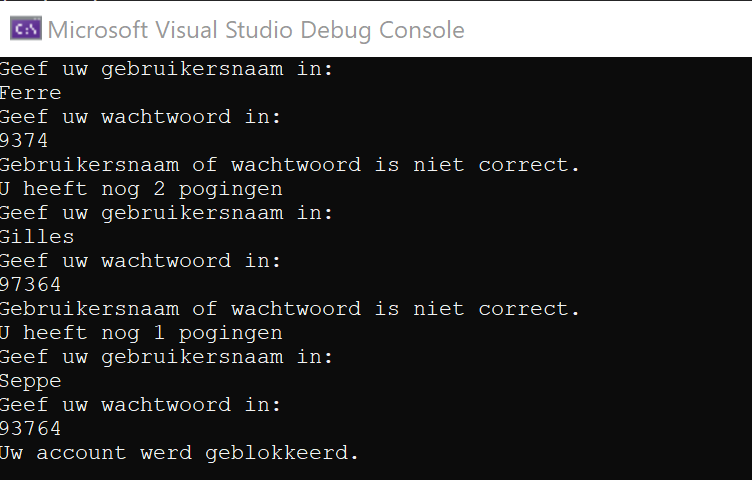 Je maakt een console-applicatie waarbij de gebruiker fictief moet aanmelden. De gebruiker moet een gebruikersnaam- en wachtwoordcombinatie ingeven. Als de combinatie correct is, wordt de gebruiker toegelaten. Als de combinatie niet correct is, wordt de gebruiker geweigerd. De gebruiker kan 3 keer een verkeerde combinatie ingeven. Als de gebruiker 3 keer een verkeerde combinatie ingeeft, wordt de gebruiker geblokkeerd.
