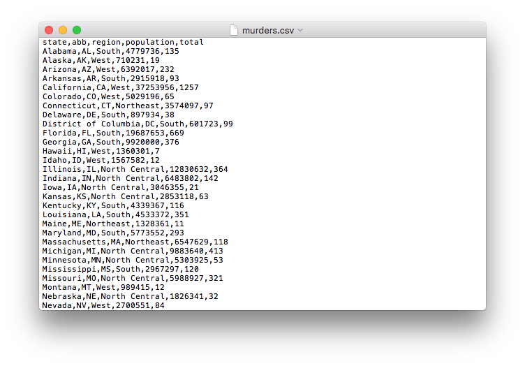 We have been using data sets already stored as R objects. A data scientist will rarely have such luck and will have to import data into R from either a file, a database, or other sources. Currently, one of the most common ways of storing and sharing data for analysis is through electronic spreadsheets. A spreadsheet stores data in rows and columns. It is basically a file version of a data frame. When saving such a table to a computer file, one needs a way to define when a new row or column ends and the other begins. This in turn defines the cells in which single values are stored.