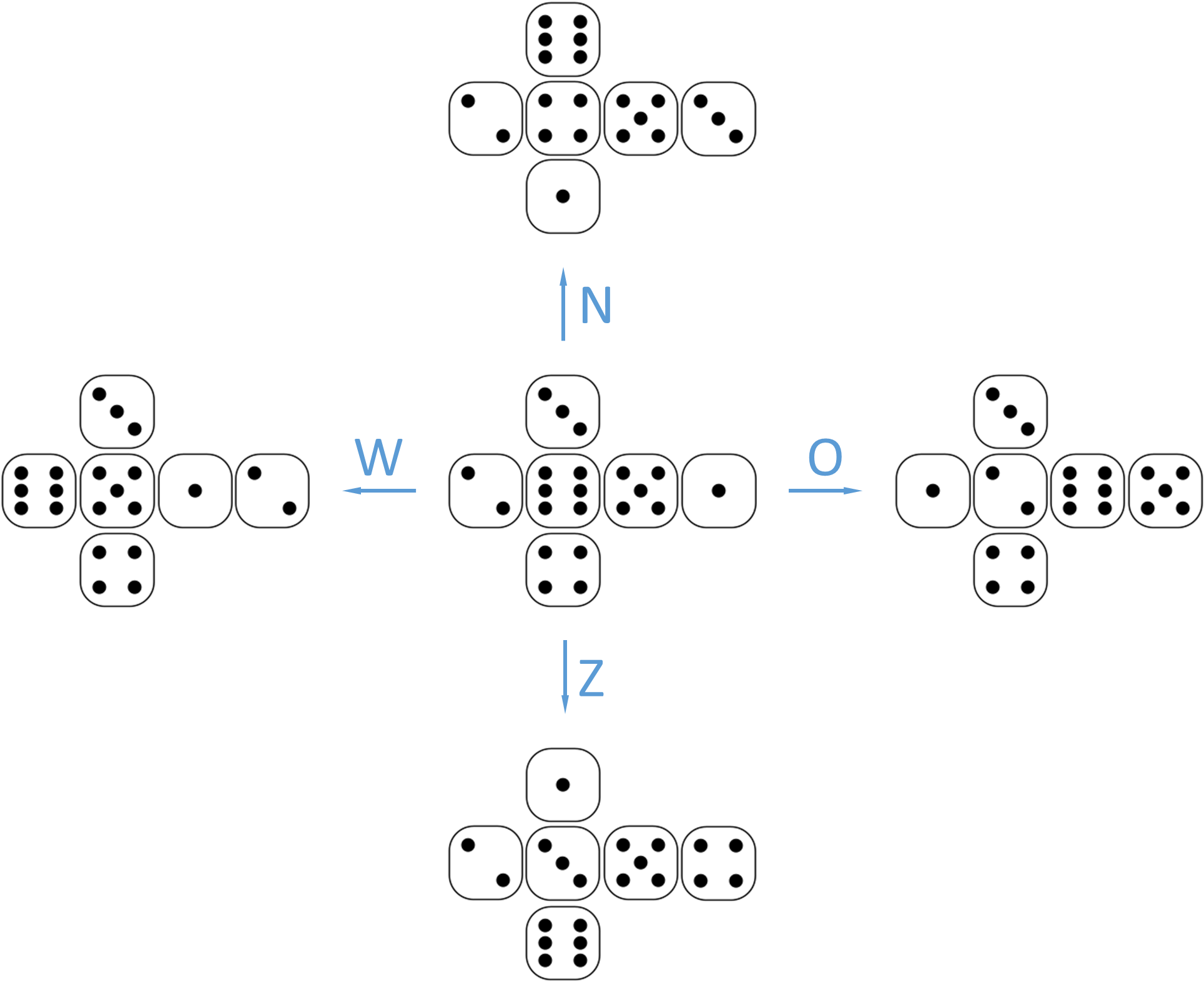 Definieer een klasse Dobbelsteen waarmee dobbelstenen kunnen voorgesteld worden in JavaScript die op een bepaalde manier voor je op tafel liggen. Deze dobbelstenen moeten een kwartslag kunnen gedraaid worden in een bepaalde richting, volgens het model dat omschreven wordt in onderstaande figuur. Hierbij worden dobbelstenen op een schematische manier voorgesteld, zodat alle zijden van de dobbelsteen zichtbaar gemaakt worden. Het centrale schema stelt bijvoorbeeld een dobbelsteen voor waarbij de 6 bovenaan ligt, de 3 achteraan, de 4 vooraan, de 2 links, de 5 rechts en de 1 onderaan. De vier andere schema’s geven aan hoe de dobbelsteen gaat liggen als je vanuit deze positie de dobbelsteen draait naar het noorden (bovenaan), het zuiden (onderaan), het oosten (rechts) of het westen (links).