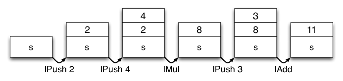 die aritmetische expressies evalueert.run :: Stack -> Prog -> Stack