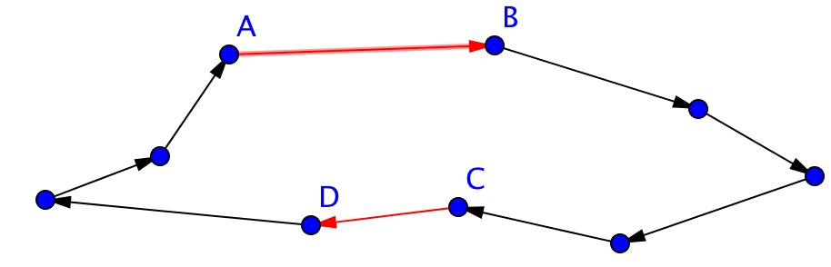 We vervangen in de volgende gegeven route bijvoorbeeld de twee verbindingen C - A en D - B door A - B en C - D: