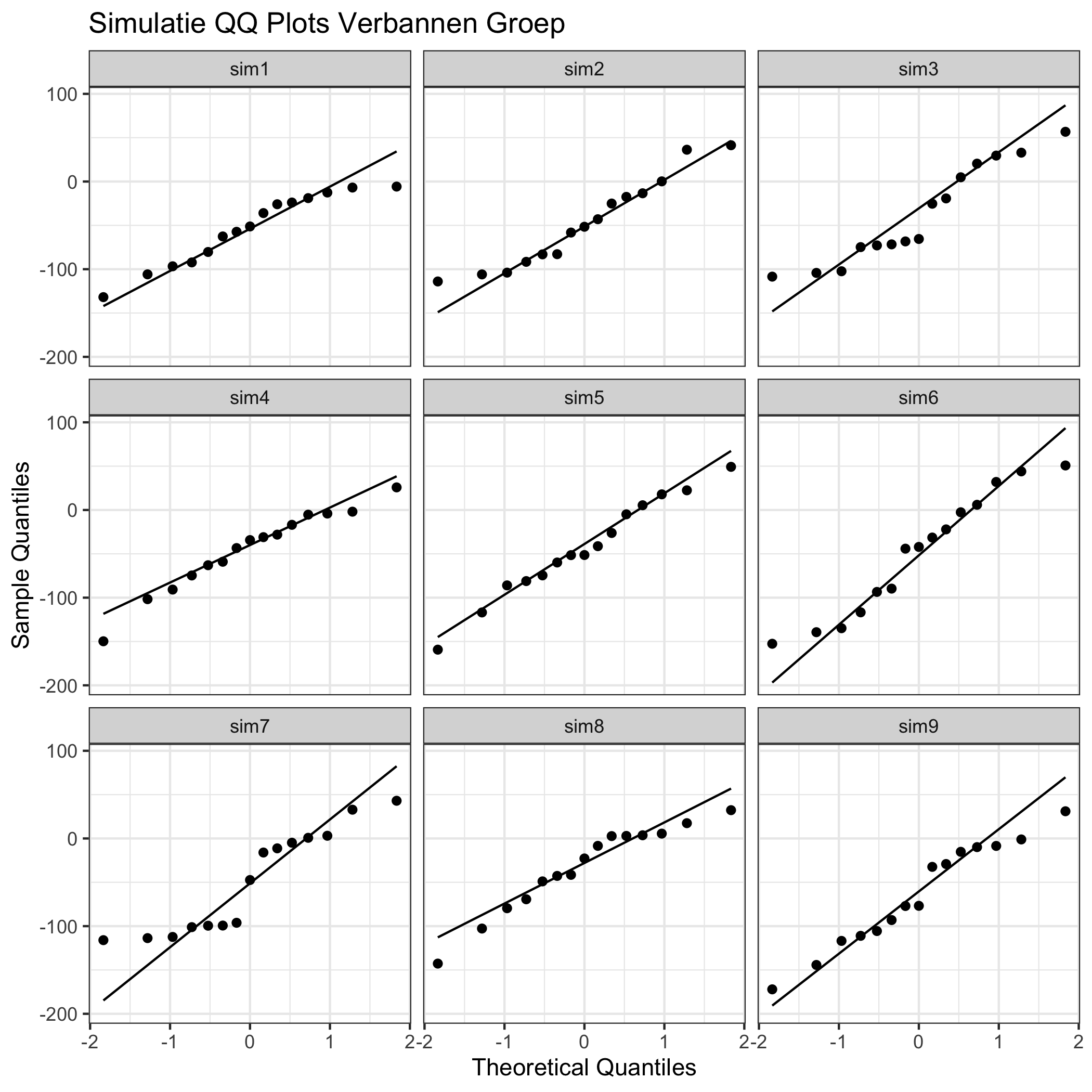 De voorwaarde van normaliteit lijkt vrij goed voldaan te zijn. De punten liggen dicht rond de rechte bij de verbannen stokstaartjes. Bij de stokstaartjes die bleven is de afwijking al iets groter. We kunnen opnieuw eens vergelijken met gesimuleerde data onder de nulhypothese. De afwijkingen die we in onze qqplot zien lijken niet uitzonderlijk te zijn.