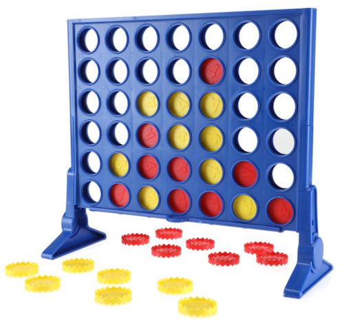 In het spelletje “4-op-één-rij” steken twee spelers afwisselend een ronde schijf in een rekje met 6 rijen en 7 kolommen. De ene speler steekt gele schrijven in het rekje, de andere rode schijven.