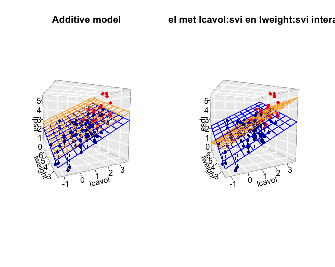 Figuur 63: Fit van het additieve model met de termen lcavol, lweight, svi (links) en het model met interacties lcavol, lweight, svi . lcavol:svi, lweight:svi (rechts). De rechtse figuur toont duidelijk dat de interactie er nu voor zorgt dat de associaties tussen de response <-> het log-tumorvolume en de response <-> het log-gewicht afhankelijk is van de status van de zaadblaasjes. De interacties zorgen voor andere hellingen bij patiënten met (rood) en zonder invasie (blauw) van de zaadblaasjes. Voor het additieve model (links) zien we enkel een verschuiving van het regressievlak, maar parallelle hellingen. Het hoofdeffect voor een factor variabele zorgt m.a.w. voor een ander intercept.