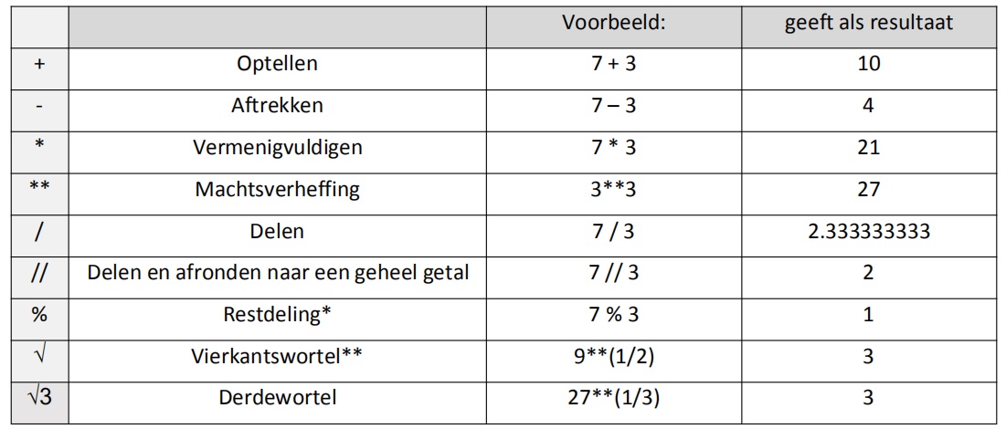 Een operator is een symbool dat de wiskundige bewerking aanduidt. Hieronder staan enkele veel voorkomende operatoren met een voorbeeld erbij:
