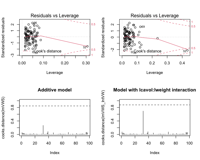 Het is duidelijk dat observatie 32 een grote leverage heeft. Het heeft in het model met interactie ook de grootste invloed van alle datapunten op de fit van het model.