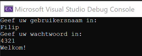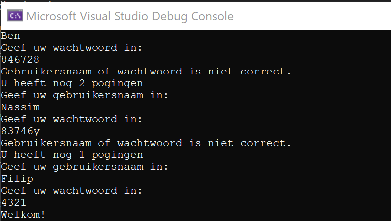Je maakt een console-applicatie waarbij de gebruiker fictief moet aanmelden. De gebruiker moet een gebruikersnaam- en wachtwoordcombinatie ingeven. Als de combinatie correct is, wordt de gebruiker toegelaten. Als de combinatie niet correct is, wordt de gebruiker geweigerd. De gebruiker kan 3 keer een verkeerde combinatie ingeven. Als de gebruiker 3 keer een verkeerde combinatie ingeeft, wordt de gebruiker geblokkeerd.