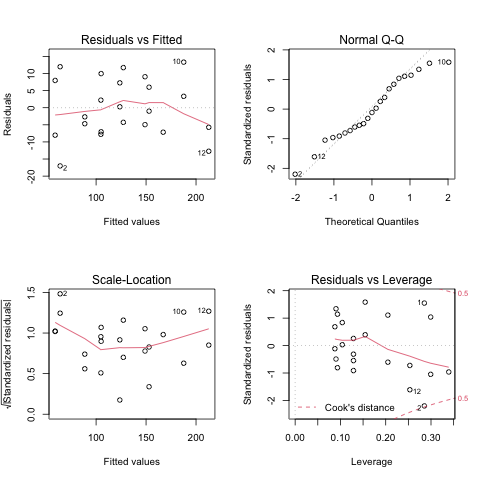 - We zien in de residual plot dat er niet voldaan wordt aan de aanname van lineariteit