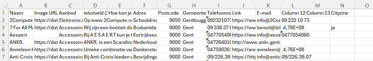 - Elke kolom bevat specifieke informatie over een lokale winkel.