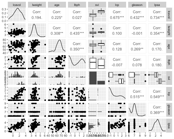 Figuur 60 toont de scatter matrix van de data en suggereert dat de lpsa sterk positief gecorreleerd is met het volume en svi. We zien verder dat lcp en lbph links-gecensureerd lijken te zijn. Er lijkt een ondergrens/detectielimiet te zijn voor deze metingen. Verder blijkt het merendeel van de gleason scores gelijk te zijn aan 6 of 7. We zullen de analyse in dit hoofdstuk beperken tot de associatie van lpsa met het log tumorvolume (lcavol), het log gewicht (lweight) en de aantasting van de zaadblaasjes (svi).